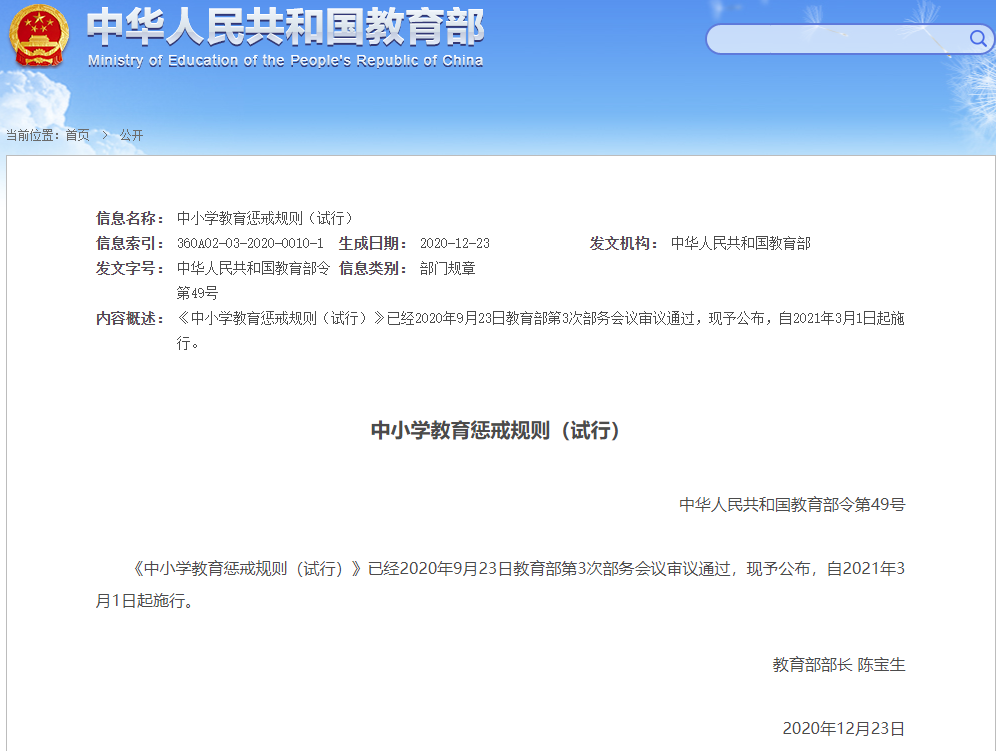《中小学教育惩戒规则(试行)》已经2020年9月23日教育部第3次部务会议审议通过,现予公布,自2021年3月1日起施行。