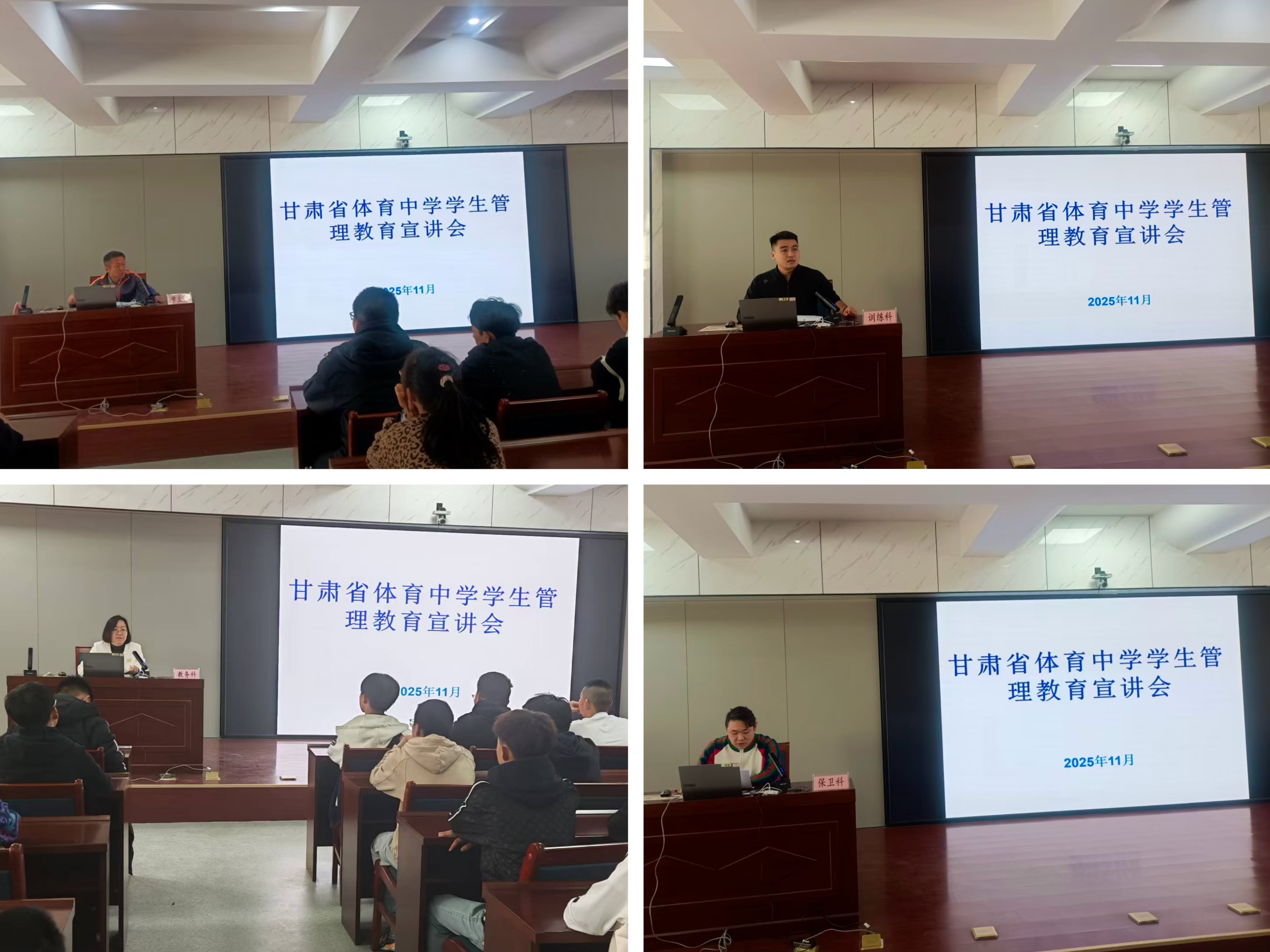 为进一步提升义务教育阶段学生管理工作水平,筑牢校园安全防线,帮助学生深入了解学校各项规章制度,规范日常行为,11 月 3 日,甘肃省体育中学开展了 2025 秋季学期学生管理教育宣讲活动。训练科、教务科、学生科、保卫科相关负责人及全体学生共同参与此次活动。